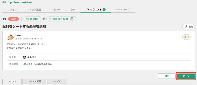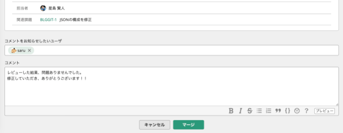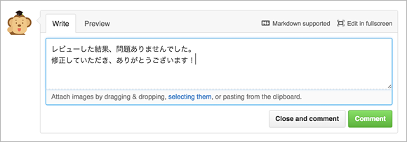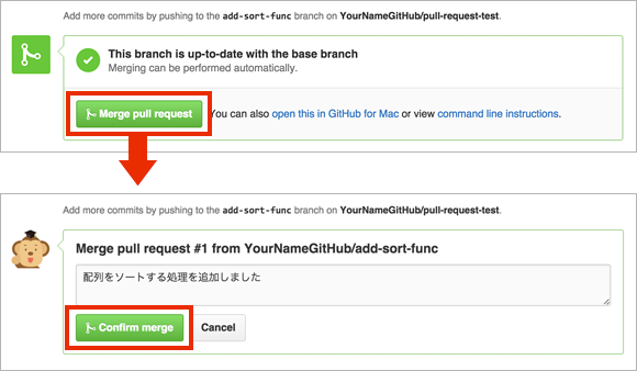 會顯示以下畫面。請附上適當的評論後,點擊「Confirm merge」進行合併。另外,對開發者來說被合併是一件很開心的事。請務必附上感謝的話語來留下評論。