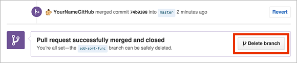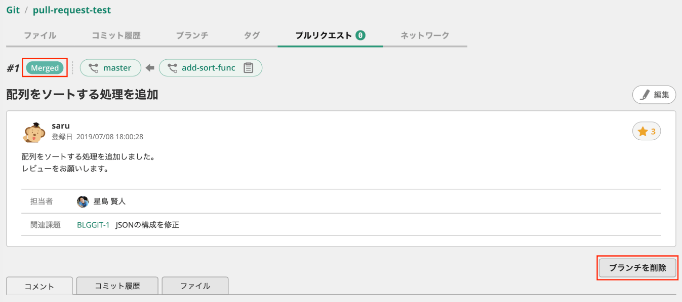 合併後會顯示以下畫面。會出現「Delete branch」按鈕。不再需要的開發分支可以從這裡刪除。