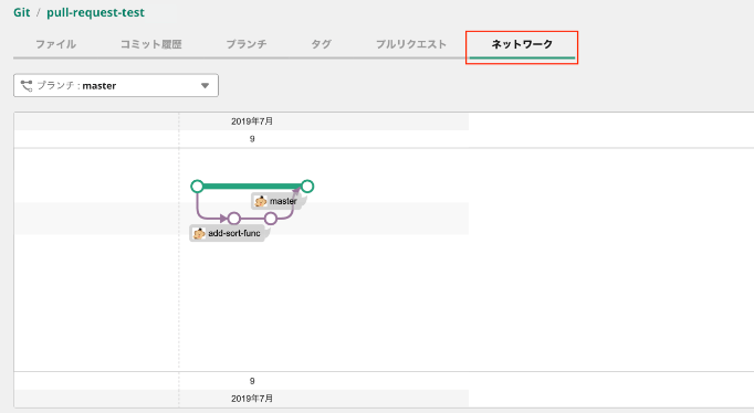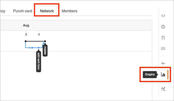 查看「Graphs」選單的「Network」分頁,可以確認開發分支已經合併到主分支。