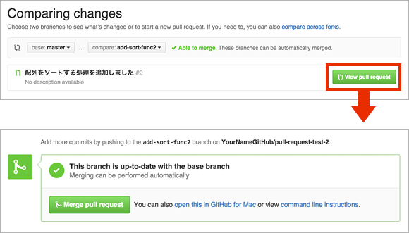 發生衝突時需要手動合併。在正在進行開發的分支上,合併Pull Request的目標分支(在這個例子中是master)。